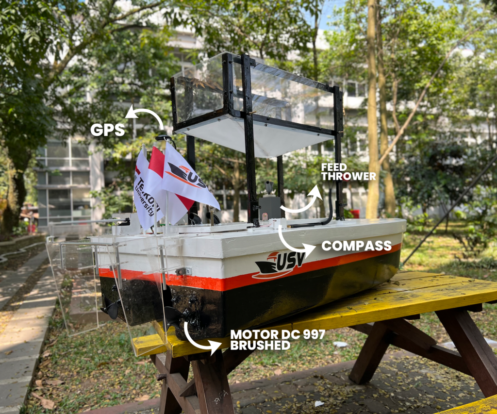 USV (Unmanned Surface Vehicle) Fish Feeder is a water-based robot designed to feed fish automatically. The USV fish feeder has the advantage of being able to reduce production costs and the time required in manual feeding. The USV Fish Feeder can cover a large area of pond to feed evenly.